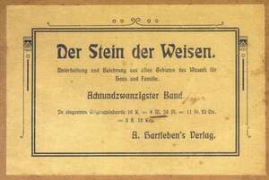 Hartleben – Ausgabe, inhaltlich wie die Prachtbände (voll illustriert), aber mit einfachem Einband, Autor / Titel in Gold eingeprägt. Übergroßes Format, Text wie in einer Zeitung in Spalten gedruckt (entspricht dem Abdruck des Textes in der Zeitschrift „Der Stein des Weisen“ – siehe auch weiter unten auf dieser Seite). |